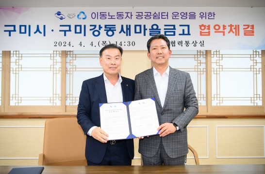 [뉴스서치] 구미시는 4일 시청에서 구미강동새마을금고와 이동 노동자들의 접근성과 편의성을 높이고, 편안한 휴식 공간을 제공하기 위해‘休마루’이동 노동자 공공 쉼터 운영을 위한 업무협약(MOU)을 체결했다.