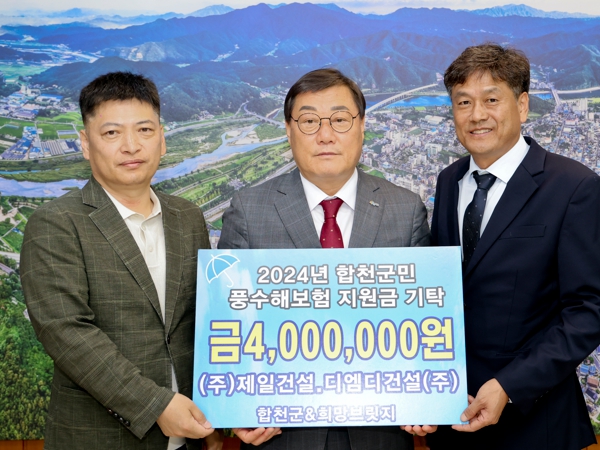 ㈜제일건설, 디엠디건설(주)은 “풍수해보험 지원금 기탁을 통해, 풍수해로 인한 주택피해 시 합천군민에 큰 도움이 되길 바란다”고 말했다.