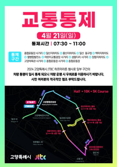 2024 고양특례시-JTBC 하프 마라톤 대회가 21일 개최됨에 따라 고양종합운동장 인근, 고양대로, 경의로, 호수로 등 고양시 주요 도로의 교통이 통제된다. 통제시간은 오전 7시 30분~11시다.