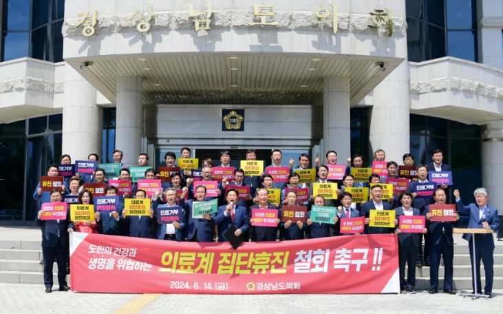 [뉴스서치] 경상남도의회 김진부 의장을 비롯한 도의원 전원은 6. 14,도의회 현관 앞에서 성명서를 발표하고 오는 6월 18일로 예고된 의료계 집단 휴진 결정과 관련해 국민의 건강과 생명을 담보로 하는 집단휴진 방침을 즉각 철회할 것과 생명을 지키는 의사로서의 직업적 가치와 사명감으로 경상남도의사회가 지역 의료현장을 지켜줄 것을 간곡히 요청했다.