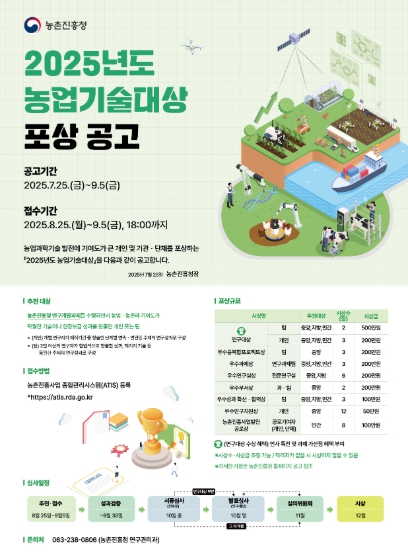 [뉴스서치] 농촌진흥청은 농업과학기술 발전에 크게 기여한 개인 또는 기관・단체를 포상하는 ‘2025년도 농업기술대상’ 후보자 추천을 공모한다.