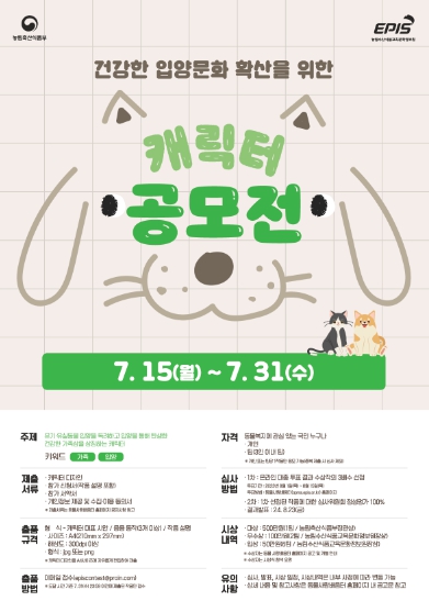 [뉴스서치] 농림축산식품부는 유기·유실 동물에 대한 인식개선 및 입양 활성화를 위한 ‘캐릭터 공모전’을 7월 31일까지 개최한다.