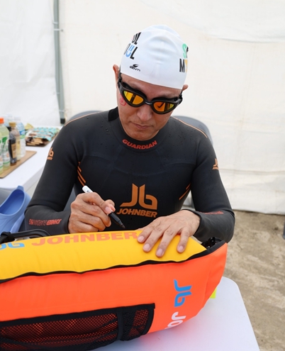 ▲ 오세훈 서울시장이 30일 ‘쉬엄쉬엄 한강 3종 축제’ 1일차 수영종목 출발에 앞서 안전부이에 ‘수영하기 너무 좋은 한강으로 오세요, 수질 환상적!’ 문구를 쓰고 있다. |