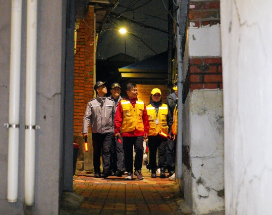 ▲ 지난 15일 이필형 동대문구청장이 안심귀가 스카우트 대원, 동대문경찰서 관계자들과 골목길 야간 순찰을 하고 있다. |