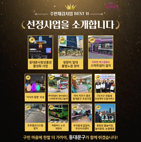 ‘주민체감 BEST 11’ 선정결과 및 1~110위까지 사업별 세부내역은 12일 오후부터 동대문구 누리집에서 확인할 수 있다.
