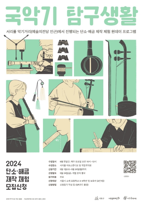 단소 수업은 서리풀아트스튜디오(예술의전당 제1지하보도)와 국립국악원 국악박물관에서 이뤄지고, 해금 수업은 서리풀아트스튜디오에 ‘해금 연구소 무궁’ 제작자가 직접 방문해 진행될 예정이다.