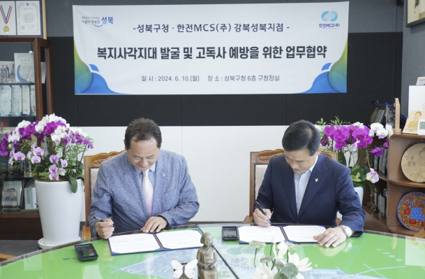 [뉴스서치] 서울 성북구가 10일 성북구청 6층 구청장실에서 한전MCS(주) 강북성북지점과 복지사각지대 발굴 및 고독사 예방을 위한 업무협약을 체결했다고 밝혔다.