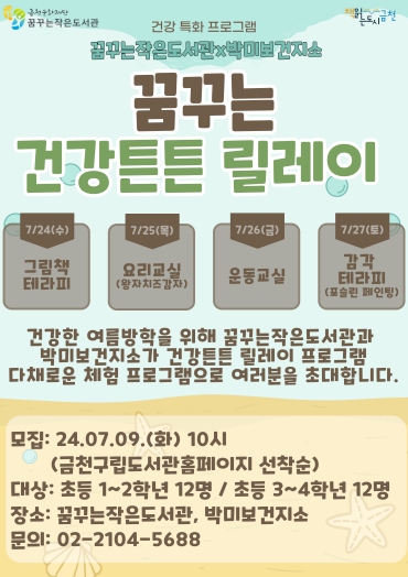 [뉴스서치] 금천구는 여름방학 어린이 건강 프로그램 ‘꿈꾸는 건강튼튼 릴레이’를 오는 24일부터 27일까지 진행한다고 밝혔다.