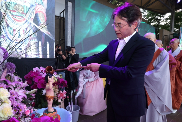 ▲ 이동환 시장이 불상에 물은 끼얹고 있다. (번민을 씻어내는 의식) |