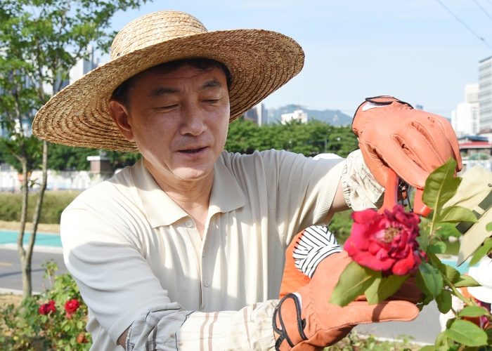▲ 김동근 시장이 6월 21일 중랑천 장미정원 가꾸기 행사에 참여해 장미를 다듬고 있다. |