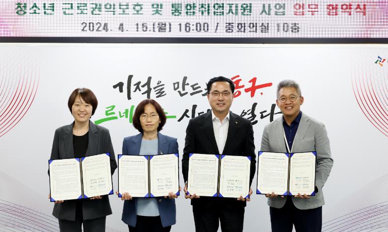 협약에는 대전 동구, 대전지방고용노동청, 대전청소년위캔센터, 대전광역시학교밖청소년지원센터가 참여했으며, 각 기관은 전문성을 활용해 청소년들의 부당한 근로 침해를 방지하고 안정적인 사회 진출 적응을 지원하기 위한 체계 구축에 힘을 모으기로 약속했다.