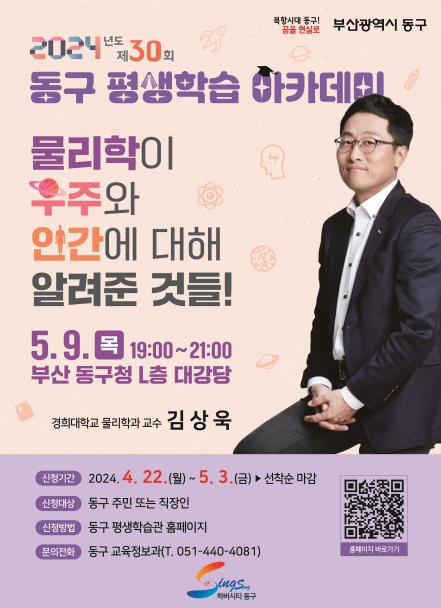 [뉴스서치] 부산광역시 동구는 5월 9일 오후 7시부터, 동구청 로비(L)층 대강당에서 경희대학교 물리학과 김상욱 교수를 초청하여 제30회 동구 평생학습 아카데미를 개최한다.