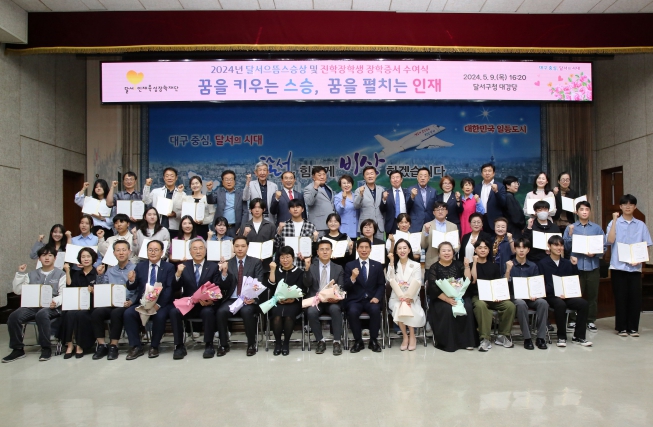 [뉴스서치] 대구 달서구가 9일 구청 2층 대강당에서 초·중·고 우수교사 3명에게 달서으뜸스승상 시상과 2024년 대입에서 우수한 성적을 거둔 진학장학생 32명에게 장학금 전달식을 진행했다.