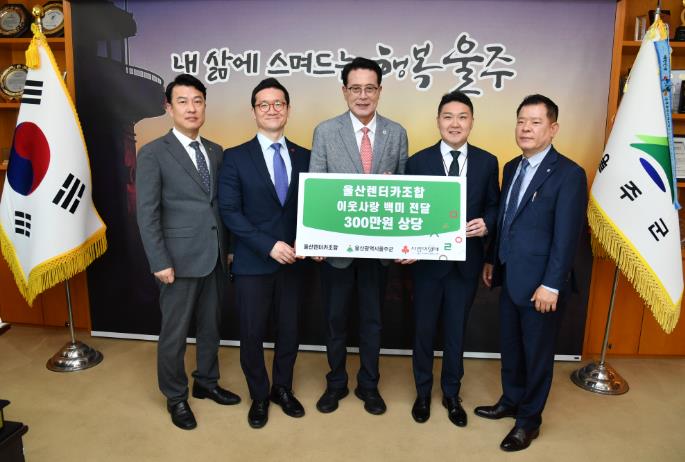 [뉴스서치] 울산 렌터카조합이 13일 울주군청 군수실에서 이순걸 군수, 백승재 이사장, 울산사회복지공동모금회 양호영 사무처장 등이 참석한 가운데 취약계층 지원을 위한 사랑의 백미 1t을 전달했다.