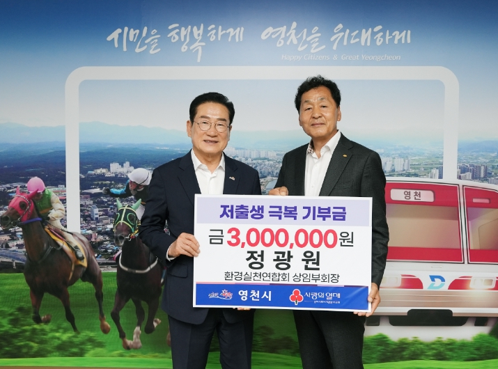 [뉴스서치] 영천시는 15일 정광원 환경실천연합회 상임부회장이 300만 원, 손종환 법무사가 100만 원을 각각 저출생 극복 성금으로 기탁했다고 밝혔다.