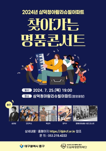 [뉴스서치] 대구 중구와 중구 도심재생문화재단은 오는 25일 삼덕청아람리슈빌아파트에서 ‘찾아가는 명품콘서트’를 개최한다.