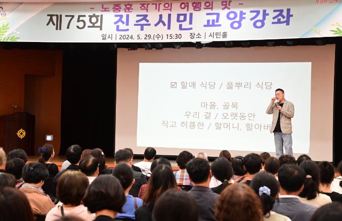 [뉴스서치] 진주시는 29일 시청 시민홀에서 200여 명의 시민들이 참석한 가운데 노중훈 여행작가를 초빙해‘여행의 맛’이라는 주제로‘제75회 진주시민 교양강좌’를 개최했다.