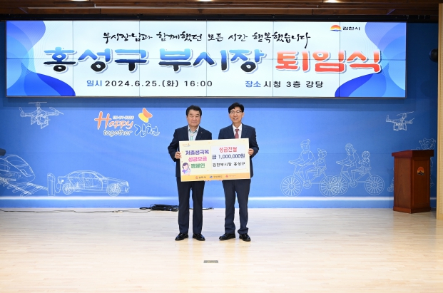 김충섭 김천시장은 “영예로운 퇴임식 날 마지막까지 지역사회를 위한 나눔을 실천해주신 홍성구 부시장님께 존경과 감사의 인사를 드린다”라며 “앞으로도 우리 시에 대한 변함없는 관심과 애정을 부탁드리며, 곧 펼쳐질 제2의 인생 또한 찬란하게 빛나길 응원하겠다”라고 말했다.