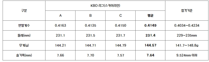 이번 검사는 KBO 리그 단일 경기사용구인 ㈜스카이라인스포츠 AAK-100의 샘플 3타를 무작위로 수거한 뒤 지난 26일(금)부터 29일(월)까지 국민체육진흥공단(KSPO) 한국스포츠개발원 스포츠용품 시험소에 의뢰해 진행했다. 검사 결과, 모든 샘플이 합격기준을 충족한 것으로 확인됐다.