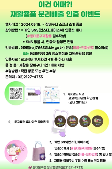 참여 상품인 재활용 장바구니는 우편으로 수령할 수 있으며, 개인 SNS 계정이 없는 구민은 동대문구청 3층 청소행정과로 방문해 촬영 사진을 보여주면 장바구니를 받을 수 있다.