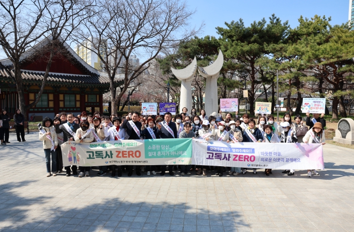 [뉴스서치] 대구 중구는 21일 경상감영공원, 동성로 일원에서 즐생단(즐거운생활지원단), 생활지원사, 각 동 복지담당공무원, 종합사회복지관 고독사 담당자 등 70여 명이 참석한 가운데 고독사 예방 및 복지위기가구 발굴을 위한 민·관 합동 고독사 ZERO 캠페인을 진행했다.
