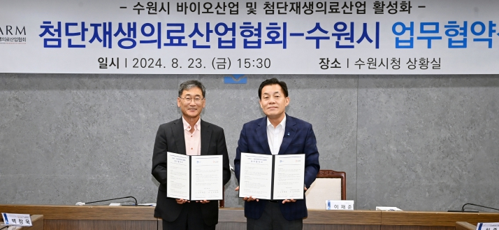 수원시와 첨단재생의료산업협회는 23일 시청 상황실에서 업무협약을 체결하고 협력을 약속했다. 협약식에는 이재준 수원시장과, 첨단재생의료산업협회 이득주 회장 등이 참석했다.