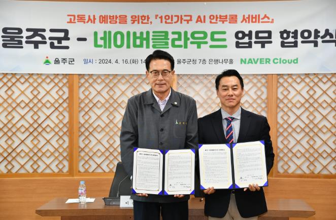 [뉴스서치] 울산시 울주군이 16일 네이버㈜와 고독사 예방을 위한 ‘1인 가구 AI 안부콜 서비스’ 운영 협약을 체결해 이달부터 시범사업을 추진한다고 밝혔다.