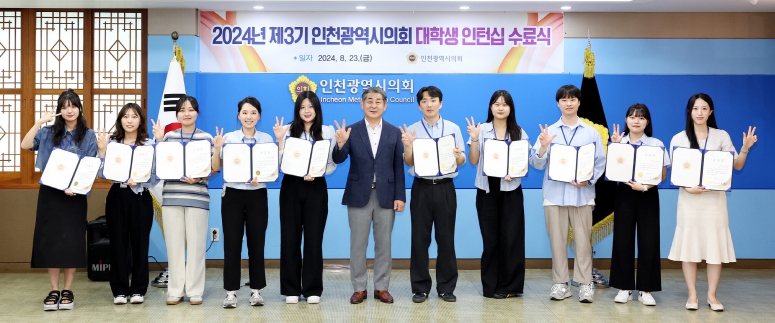 인천시의회는 23일 접견실에서 정해권 의장을 비롯해 김상섭 사무처장, 대학생 인턴 10명 등이 참석한 가운데 ‘제3기 대학생 인턴 수료식’을 개최했다.