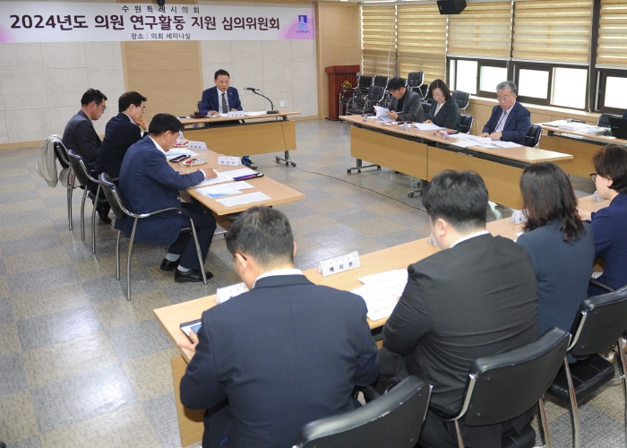 [뉴스서치] 수원시의회는 15일 의회 세미나실에서 ‘수원시의회 의원연구활동 지원 심의위원회’를 열고 2024년도 의원연구단체의 등록과 연구활동 계획 승인에 관한 사항을 심사했다.