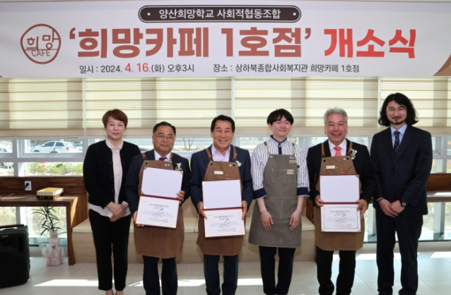 [뉴스서치] 양산시는 상하북종합사회복지관(상북면 삼계동길 27) 1층 카페 공간에 양산희망학교 사회적협동조합의 중증장애인 취업과 실습 장소 제공을 위한‘희망카페’1호점을 16일 개소했다고 밝혔다.