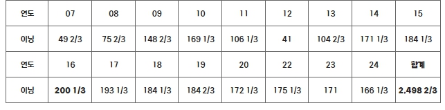 24일(화)까지 개인 통산 2,498 2/3이닝을 던진 양현종은 1 1/3이닝만 채우면 20년 만에 2,500이닝 달성 선수 명단에 이름을 올리게 된다.