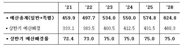 [뉴스서치] 정부는 전체 세출예산의 75.0%를 상반기에 배정하는 내용의 「2026년도 예산배정계획」을 12.9일(화) 국무회의에서 확정했다.