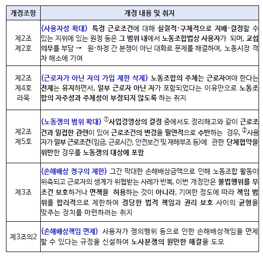 ▲ 노동조합법 개정 취지 및 주요 조항의 내용 |