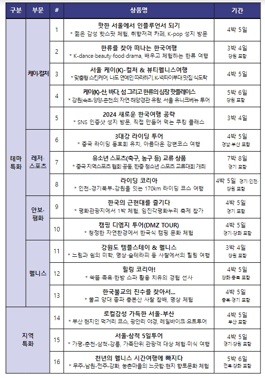 문체부는 한국여행업협회와 함께 중국 단체관광객 유치 전담여행사(이하 중국 전담여행사)를 대상으로 우수여행상품 공모전(7. 15.~29.)을 열어 최종 12개사의 16개 상품을 선정했다. 16개 상품은 케이-컬처 부문 5개, 레저‧스포츠 부문 3개, 안보‧평화 부문 2개, 치유‧휴양(웰니스) 부문 3개, 지역특화 부문 3개다. 대표 상품으로는 ▴(케이-컬처) 직접 체험하는 한류로 ‘2024 새로운 한국여행 공략’, ▴(레저‧스포츠) 생활 체육 동호회‧청소년 단체 대상 ‘3대 강 라이딩 투어’, ‘축구‧농구 등 유소년 스포츠 교류’, ▴(안보‧평화) 때 묻지 않은 자연환경과 평화의 역사를 경험할 수 있는 ‘캠핑 디엠지(DMZ) 투어’, ▴[치유‧휴양(웰니스)] 느림과 쉼의 미학, 사찰에서의 힐링 여행을 경험하는 ‘강원도 템플스테이 & 웰니스’, ▴(지역특화) 휴양 목적의 중국 2030 세대를 대상으로 하는 ‘천년의 시간여행에 빠지다’ 등이 있다.