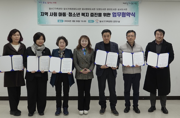 [뉴스서치] 달서구가족센터와 달서구립 5개 도서관(달서가족문화도서관, 달서영어도서관, 도원도서관, 본리도서관, 성서도서관)이 지난 26일 달서구 지역 사회 아동・청소년 복지 증진을 위해 업무협약식을 진행했다.