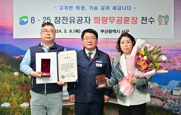 [뉴스서치] 부산 서구는 지난 9일 6·25전쟁에 참전해 공을 세운 故김행태 님의 조카 김주형 씨에게 화랑무공훈장을 전수했다.