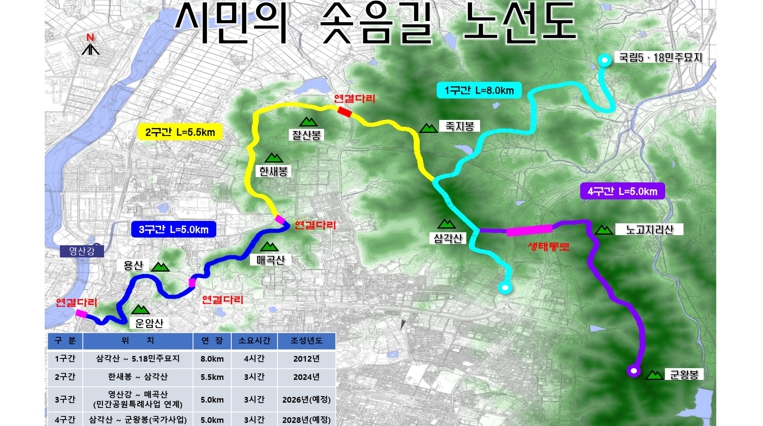 한편 시민의 솟음길 1구간(문흥동~삼각산~국립5․18민주묘지)은 지난 2012년 조성됐으며 향후 북구는 민간공원특례사업 협력을 통해 한새봉, 매곡산, 운암산을 거쳐 영산강으로 이어지는 3구간 사업을 2026년까지 완료하고 군왕봉과 삼각산을 잇는 4구간은 내년 기본설계를 시작하여 2028년까지 단계적으로 국비를 확보해 사업을 마무리할 방침이다.