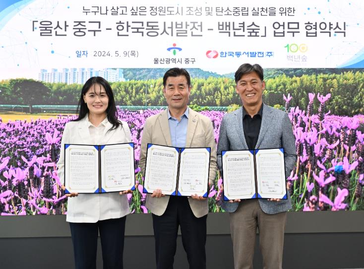 [뉴스서치] 울산 중구와 한국동서발전㈜, 백년숲사회적협동조합이 5월 9일 오후 4시 한국동서발전㈜ 이사회 회의실에서 누구나 살고 싶은 정원도시 조성 및 탄소중립 실천을 위한 업무협약을 맺었다.