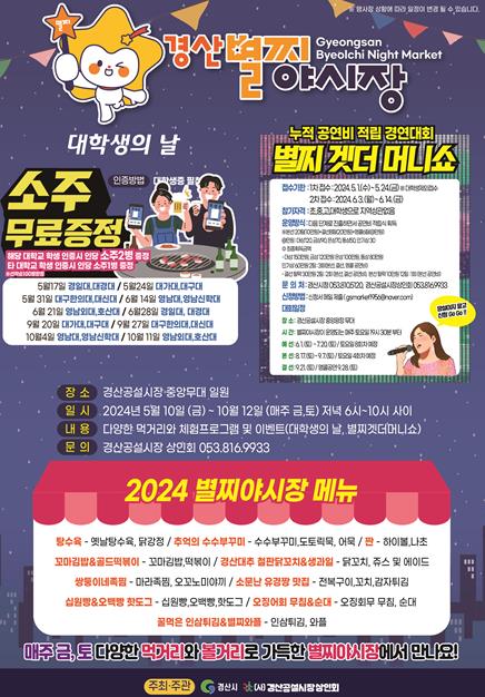 [뉴스서치] 경산시는 오는 10일 오후 6시에 경산공설시장 중앙광장에서 전통시장 활성화를 위한 ‘2024 경산별찌야시장’을 개장한다.