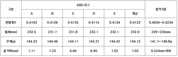 이번 검사는 KBO 리그 단일 경기사용구인 ㈜스카이라인스포츠 AAK-100의 샘플 5타를 무작위로 수거한 뒤 지난 3월 21일(금)부터 24일(월)까지 국민체육진흥공단(KSPO) 한국스포츠개발원 스포츠용품 시험소에 의뢰해 진행했다. 검사 결과, 모든 샘플이 합격기준을 충족한 것으로 확인됐다.