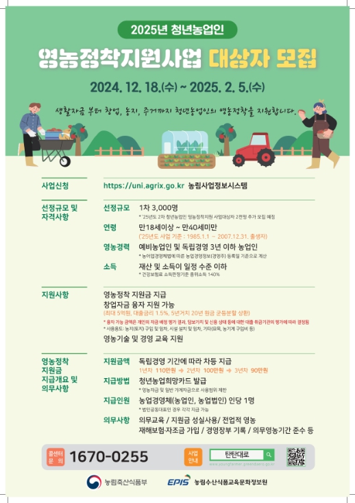 [뉴스서치] 농림축산식품부는 12월 18일부터 「2025년 청년농업인 영농정착지원사업」 대상자 선발을 위한 1차 모집을 시작했다.