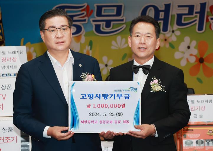 군에 따르면 지난 25일 서상중고등학교 체육관에서 열린 서상중학교 총동문회 개회식 현장에서 함양군의 발전을 성원하는 마음으로 동문 일동이 100만 원을 기부하며 고향사랑기부제에 동참했다.