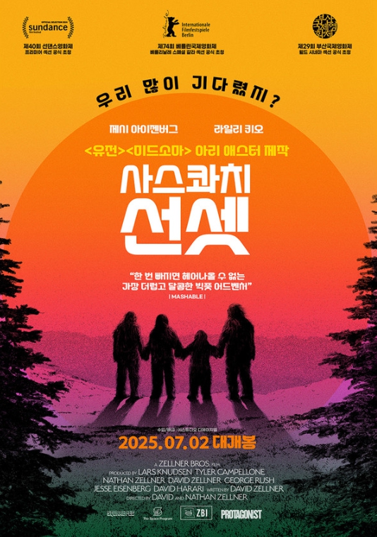[뉴스서치] '유전''미드소마' 아리 애스터 감독이 총괄 프로듀서로 참여했으며, 선댄스, 베를린, SXSW, 부산을 발칵 뒤집은 귀여운 문제작 '사스콰치 선셋'이 7월 16일(수) 바로 오늘부터 극장 동시 IPTV & VOD 서비스를 시작한다.[감독: 데이비드 젤너, 나단 젤너 | 제작: 아리 애스터 | 출연: 제시 아이젠버그, 라일리 키오, 나단 젤너, 크리스토프 자야츠 데넥 | 장르: 코미디, 어드벤처 | 수입/배급: ㈜스튜디오 디에이치엘]