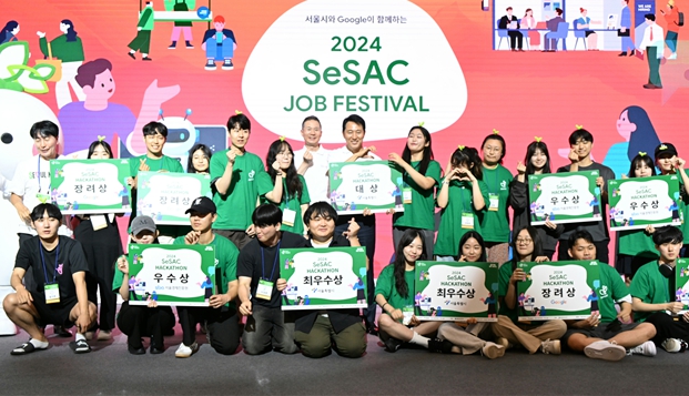▲ 8월 2일 동대문디자인플라자(DDP)에서 열린 '2024 새싹(SeSAC) 잡 페스티벌‘ 현장을 찾은 오세훈 서울시장이 새싹 해커톤 시상식에서 시상하고 수상팀들과 기념촬영하고 있다.(사진 가운데 오세훈 서울시장, 김경훈 구글코리아 사장(왼쪽)) |