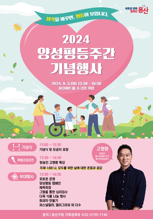 [뉴스서치] 서울 용산구가 양성평등주간(9월 1~7일)을 맞아 오는 3일 오후 3시 용산아트홀(녹사평대로 150) 소극장 가람에서 기념식을 개최한다. 양성평등을 넘어 ‘모두를 위한 존중과 공감’이라는 평등의 의미를 확산하기 위한 자리다.