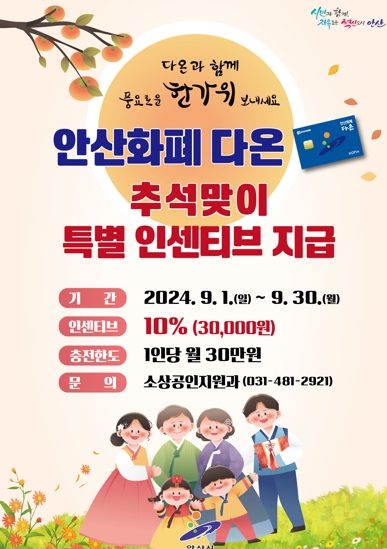 [뉴스서치] 안산시는 추석 명절을 맞아 9월 한 달 동안 안산 지역화폐 다온의 ‘특별 인센티브’를 지급한다고 31일 밝혔다.