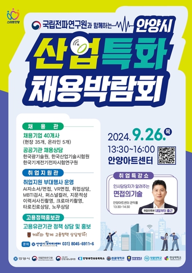 [뉴스서치] 안양시는 국립전파연구원과 함께 ‘산업특화 채용 박람회’를 오는 9월 26일 오후 1시 30분 안양아트센터에서 개최한다고 1일 밝혔다.