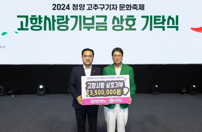 [뉴스서치] 청양군은 지난 8월 30일 고추․구기자문화축제 개막식에서 김돈곤 청양군수와 박희조 대전 동구청장이 고향사랑 상호기부(3백5십만원) 기탁식 및 응원메시지를 전달하는 행사를 가졌다고 밝혔다.
