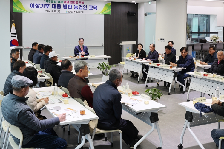 [뉴스서치] 칠곡군은 지난 28일 농업기술센터에서 김재욱 군수를 비롯해 식량·원예·축산 품목별연구회 회장 및 사무국장, 작목반장 등 40여 명이 참석한 가운데 ‘이상기후 대응 방안 농업인 교육’을 실시했다.