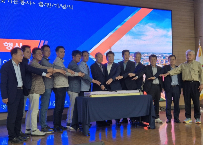 ‘평택항 신생매립지 되찾기 운동사’ 출판기념식은 ▲식전공연▲내빈소개▲평택항 신생매립지 경계분쟁 승소 경과보고▲유공자 감사패 증정▲기념사 및 축사▲회고사▲승소 축하 케이크 절단식 순으로 진행됐다.